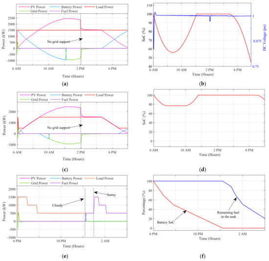 (a) Daily power flow in the normal scenario: solar, battery, BSA load, fuel cell power, and grid interaction power. (b) Normal scenario battery SoC and DC voltage of the PV side throughout the day. (c) Daily power flow in load shedding scenario: solar, battery, BSA load, fuel cell power, and grid interaction power. (d) Load shedding scenario battery SoC throughout the day. (e) Daily power flow in night and emergency scenarios: solar, battery, BSA load, fuel cell power, and grid interaction power. (f) Night and emergency scenario battery SoC and remaining fuel percentage in the fuel tank throughout the day.