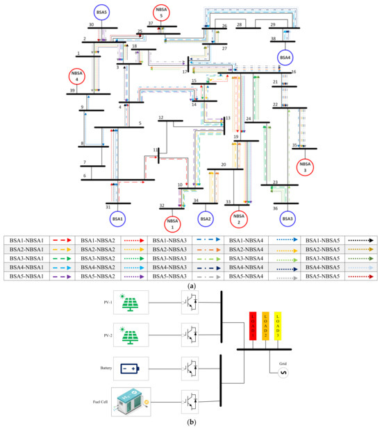 At this point, if the weather forecast for the following day indicates cloudiness, the system prioritises power supply to only the most critical load starting from midnight. Conversely, if a sunny day is predicted, the system activates the fuel cell to power all loads starting around 1 AM. This approach ensures that the energy management strategies are tailored to meet user preferences, embodying a user-focused design in the power distribution framework. Moreover, by incorporating next-day solar irradiance forecasts, the system can make informed decisions on load management, thereby enhancing the reliability and efficiency of power provision for upcoming operations. Figure 8 illustrates the grid topology utilised for testing the proposed energy management system. Specifically, Figure 8a depicts the IEEE 39 standard bus system, which serves as the testing environment for the TL-EMS. Conversely, Figure 8b represents the distribution network used to evaluate the DL-EMS.