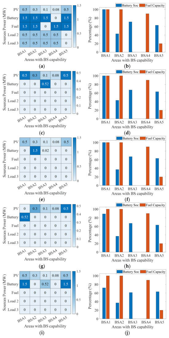The HLC then recalibrates its optimisation algorithm for these altered conditions, determining the best power allocation for starting G1, as depicted in Figure 9g. This allocation still relies on solar power from all BSAs and the battery from BSA1, deemed the most efficient pathway to G1. Figure 9h updates the SoC and fuel percentages following the cranking of G1. After 20 min, G1 successfully starts and is synchronised with the unified grid. The HLC then initiates the startup of the final generator on the list, G5, which requires 5 MW of cranking power. This power is sourced from the most cost-effective options, primarily solar, and from BSAs that contribute to increasing inertia, specifically BSA1 and BSA5, while minimising reliance on the more expensive fuel cell power. This allocation strategy is illustrated in Figure 9i. Furthermore, Figure 9j presents the final SoC and fuel percentages following system restoration. The cranking of G5, lasting 30 min, leads to its successful startup and synchronisation with the entire network, marking the completion of the system’s full restoration. At this point, the HLC issues a command for all BSAs to exit black start mode and return to their standard operational pathways.