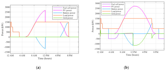 Figure 11 illustrates the results of the comparative analysis at the distribution level. Figure 11a presents the outcomes of the method in [27], while Figure 11b shows the results of the proposed method. As depicted in Figure 11a, the battery supports the three loads from 12 AM to 3:30 AM when no sunlight is available. However, the battery reaches 0% SoC, leading to the disconnection of the loads, including the most critical load, due to the absence of an emergency scenario. In contrast, the proposed method includes an emergency scenario and supplies the most critical load during the same period, as shown in Figure 11b. Moreover, as the sun rises and solar power increases, the battery starts recharging and is fully charged by around 12 PM. After this time, the system in [27] must switch the solar power to voltage control mode instead of maximum power point tracking to stabilise the system, resulting in suboptimal use of the excess power. However, the proposed method, being grid-connected, allows the excess power to be delivered to the grid, thereby maximising the utilisation of solar power. Finally, around 9 PM during the night period, the battery discharges again. Without hydrogen fuel cell emergency support, the most critical load will be disconnected, as shown in Figure 11a,b after 9 PM.