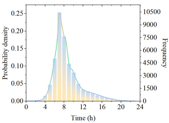 The spatiotemporal characteristics of EVs can be effectively analyzed by leveraging traditional household travel survey data [32]. Additionally, it has been observed that users exhibit a higher frequency of travel activities on weekdays compared to holidays [33]. Simultaneously, private cars and taxis play pivotal roles in urban transportation. Therefore, this study focuses on electric private cars and electric taxis during weekdays as the primary research subjects, based on the NHTS 2017 statistical data. Furthermore, an EV travel spatiotemporal model is developed.