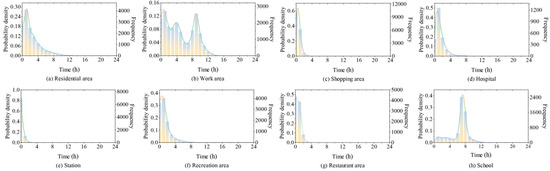 The fitting results of the duration of parking in different functional areas are illustrated in Figure 4. Gaussian mixture distribution is employed to fit the duration of parking in residential areas, work areas, stations, recreation areas, restaurant areas, and schools. Logistic distribution is utilized to fit the duration of parking in shopping areas. Generalized extreme value distribution is applied to fit the duration of parking in hospitals. Compared to the traditional methods commonly employed in the prior literature, such as fitting with normal or exponential distributions, the approach utilized in this study exhibits superior goodness of fit and enables a more precise depiction of the distribution of time variables. It is worth mentioning that the duration of parking in residential areas here pertains to the duration of brief stays at home before resuming daily travel, without factoring in the initial point of travel chains.