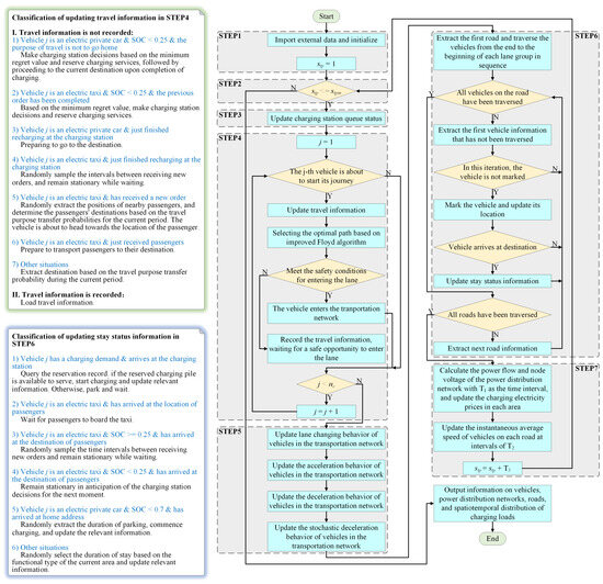 The simulation process for the spatiotemporal distribution of EV charging load is illustrated in Figure 6, with the detailed steps following.
