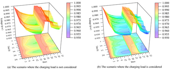 where ct represents the real-time charging price at time t; cb denotes the base charging price, set at 1 CNY/kWh; ι refers to the time-varying price adjustment factor, set at 1/3; Pt signifies the original load of the power distribution network at time t; is the average load of the power distribution network; indicates the charging price for region α at time t; is the regional price adjustment factor, set at 5; corresponds to the per unit value of voltage at the power distribution network bus that region α is connected to at time t; Ts is the total number of periods into which the day is divided, set at 96.