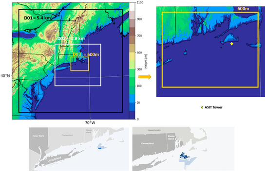 The WRF v4.4 model, which for many years has been a useful tool for operations and research [27,28,29], is applied here with two different initial and boundary conditions and two-way nested domains with the finest domain having dx = dy = 600 m (Figure 1). We chose the dynamic solver Advanced Research WRF (ARW), which uses a fully compressible, non-hydrostatic Euler equation and consists of a vertical coordinate system with terrain-following hydrostatic pressure [27]. The ARW solver uses Arakawa C-grid staggering and is capable of formulating sub-grid scale turbulence in both coordinate and physical space [27]. It provides velocity components (u and v), vertical velocity w, perturbation moist potential temperature, perturbation geopotential, and perturbation dry-air surface pressure as prognostic variables [27]. Our project is a partnership with Eversource-Orsted focusing on the South Fork Wind Farm (SFWF) in the Northeast U.S. coast. The relatively high model resolution is chosen due to our collaboration with the research group that has developed the University of Connecticut’s large-eddy simulation model to depict wind turbines at a very fine scale [30], using the WRF output as the initial and boundary conditions to the LES model.