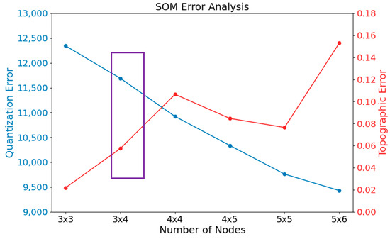 Comparing errors for different numbers of SOM nodes. The purple rectangle indicates our selected matrix suitable for the study.