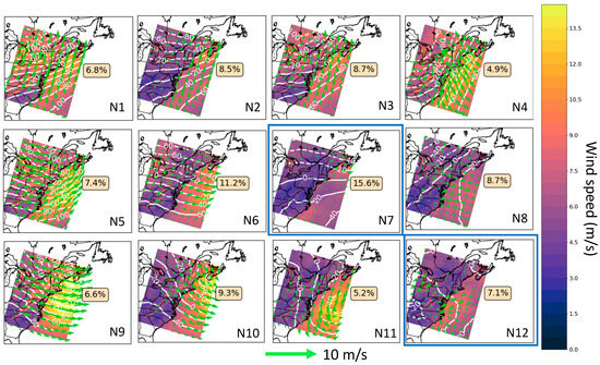 Self-Organizing Maps (SOMs) created using spatial anomaly of the geopotential height field at 850 hpa from HRRR analyses simulations for the year 2020. Each plot shows wind speed at 80 m AMSL with wind direction. We also show the percentage of samples that fall within each node, and highlight the two nodes, N7 and N12, that we focus on in this study.