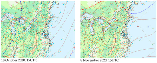 Surface analysis maps from NOAA’s Weather Prediction Center (https://www.wpc.ncep.noaa.gov/, accessed on 6 June 2023). The contour lines are isobars of mean sea level pressure (mbar).