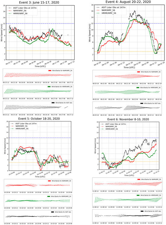 The time series plots highlighted that both model configurations for the six different anticyclonic events captured the temporal evolution of wind speed at the hub height quite well (Figure 5). Both model configurations struggled to capture the November event, which exhibited a steady upward trend of wind speed, though the NAM/WRF reached the peak at the very end of the simulation. Also, there was a sudden and frequent shift in wind direction, which prevailed from the northwest, but as wind speed dropped, the wind direction changed to become southward, ultimately settling into a southwesterly direction over time. Neither model could capture the clear westerly wind seen in the observations. In the month of January, initially, the predominant wind direction was from northwesterly to westerly, which gradually shifted to southwest because of the high-pressure system’s movement. Toward the end of the event, the wind direction reverted to northwest due to the influence of another high-pressure system developing further inland on the west. Both model configurations struggled to predict the first shift in the wind direction, but the HRRR/WRF managed to obtain the second one. In the May event, the wind was initially northeast and then shifted to a south–southeasterly direction due to the influence of the transition of high pressure. The models captured the transition very well. Like the May event, wind during the October event was initially coming from the northeast and transitioned between easterly to south-easterly and the HRRR/WRF performed better to capture the transition. In June, a northeast wind was predominant, which the models represented accurately. Finally, during the August event, winds were predominantly south–southwesterly, briefly shifting to northwesterly at the end of the event. Particularly, during the drop in the wind speed, the HRRR/WRF tended to portray the change in the wind direction closer to the observations.