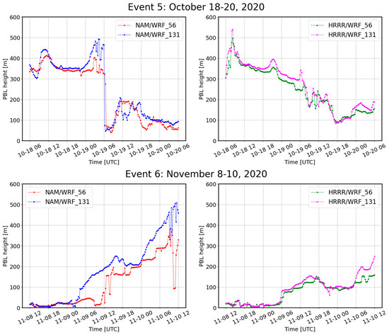 Time series of PBL height from the 600 m domain for the NAM/WRF and HRRR/WRF and two sets of vertical levels (56 and 131) at the ASIT lidar buoy location.