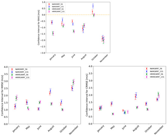 Bootstrapping confidence intervals for mean bias, RMSE, and CRMSE of wind speed at 147 m height, testing the NAM vs. HRRR initializations and 56 vs. 131 vertical levels. Non-overlapping confidence intervals designate statistically different errors. The orange lines designate the zero-bias line.