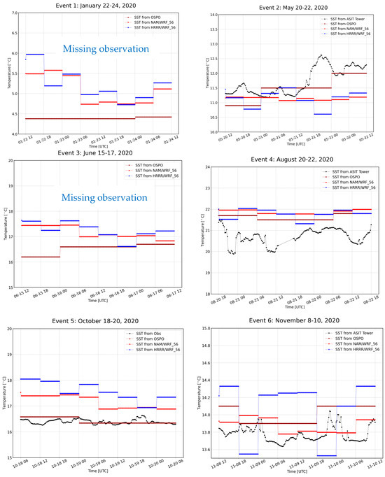 The sea surface temperature plays a critical role in the ocean–atmosphere interaction processes through vertical turbulent exchanges of momentum, heat, and moisture [62]; thus, we assessed its impact on wind prediction capability. To this end, we evaluated two SST products at the observation location. We compared the model SST (NAM and HRRR), and five external SST datasets (OSPO, OSTIA, MUR, NAVO, and GOES-16) with the ASIT observation (as mentioned in Section 2.2), to find the SST input that was closest to the observations. We decided to use the 5 km OSPO SST product as it best represented the observed SST (Figure 8). The OSPO product has incorporated data from multiple sources, including satellite imagery and in situ measurements from ships and buoys, to provide accurate and detailed information on the SST across the region, while having good coverage over the Northeast U.S. [63].