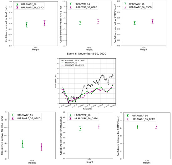 Time series of wind speed at the wind turbine hub height from the HRRR/WRF simulations and bootstrapping confidence intervals for mean bias, RMSE, and CRMSE for the May, October, and November anticyclones. We tested the HRRR initializations with 56 vertical levels and with/without the high-resolution SST input (OSPO 5 km).