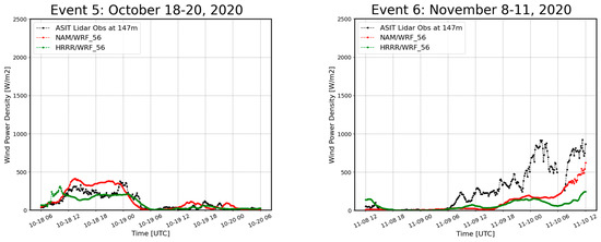 From the previous sections, the conclusion was that the initial and boundary conditions exhibited the largest influence on the hub height WRF wind prediction. The NAM/WRF and HRRR/WRF configurations were able to capture low wind speed occurrences during the presence and movement of anticyclones, providing confidence that the model is capable of reliably predicting such wind drought occurrences. Even though we selected similar types of weather patterns over the Northeast U.S. (anticyclones with low wind), there was no single configuration that performed best for all cases. Naturally, the next question was whether a similar significance would apply to the prediction of offshore wind power density, given that wind power is based on cubic wind speed.
