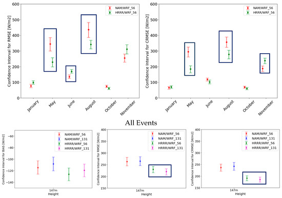 The statistically significant difference between the WRF model configurations followed the same patterns as for the hub height wind speed for the individual events (Figure 11). For the May and August anticyclones, the HRRR/WRF had a statistically lower RMSE and CRMSE compared to the NAM/WRF for the WPD. For October, the HRRR/WRF had a statistically lower BIAS compared to the NAM/WRF. For the January, June, and November anticyclones, the NAM/WRF showed better error statistics, not consistently for the same metrics though. When testing the confidence of all events together, the HRRR/WRF model configuration had a significant low model and random error (RMSE and CRMSE) compared to the NAM/WRF, while the mean bias did not exhibit any significant difference. As with the hub height wind speed, the difference between vertical levels was insignificant for the WPD error metrics (Figure 11). The mean values of all statistical metrics for the wind speed and WPD are provided in Appendix A Table A1 and Table A2.