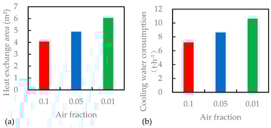 Figure 2a,b show that as the air volume fraction diminishes, the heat exchange area of the heat exchanger enlarges, accompanied by a concurrent rise in cooling water utilization. This is due to the fact that as the air fraction decreases, the ratio of oil to gas rises, so the heat exchange area must be enlarged and the cooling water increased to meet the increased heat demand. The results show that when the air volume fraction is 0.01, the heat exchange area and cooling water consumption of the heat exchanger are the largest, which are 6.06 m2 and 10.62 t/h. Therefore, a detailed design is conducted for the operating condition with an air volume fraction of 0.01.