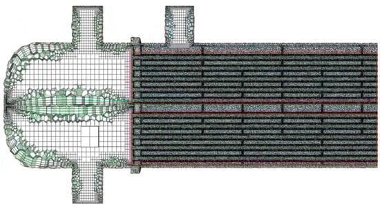 According to the detailed design results, the CFD numerical simulation of the fixed tube sheet heat exchanger was carried out. There are 164 heat exchange tubes in the model, with length of 4.5 m, wall thickness of 2 mm, outer diameter of 25 mm, and tube pitch of 22.6 mm. The specific arrangement is shown in Figure 6 below. The two ends of the heat exchange tube are installed with pore plates to fix the heat exchange tube and separate the cold and hot flow area. The inlet and outlet of the cold and hot flow of the heat exchanger feature an outer diameter of 159 mm and a wall thickness of 4.5 mm. The shell has an outer diameter of 530 mm and a wall thickness of 9 mm. Internally, 20 baffles with a thickness of 2.5 mm and a spacing of 200 mm (center distance between the front and back baffles) are employed to secure the heat exchange tubes and direct the flow. The heat exchange tube is made of steel.