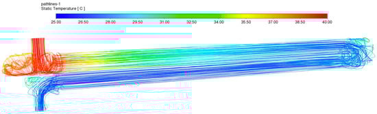The heat flow within the tube course originates from the upper inflow through the left end cap and exits through the lower outflow of the same end cap after cooling. Meanwhile, the cold flow enters the shell from the lower right side and exits from the upper left side. Figure 10 presents the temperature cloud image of the hot fluid. The overall process of the hot fluid is that the upper left entrance enters the pipe path and enters the upper part of the pipe path after being blocked by the baffle plate. Concurrently, the cold flow within the shell path serves to cool the hot fluid entering the pipe path. As the hot fluid reaches the upper portion of the right end, it experiences initial cooling. Subsequently, it flows into the lower half of the right end and undergoes a secondary cooling cycle by recirculating through the pipeline until its final exit through the outlet at the lower left end. Therefore, the hot fluid enters from the entrance; due to the cooling of the cold flow, the temperature is continuously reduced, ultimately resulting in the outflow reaching its lowest temperature at the outlet. After cooling by the heat exchanger, the weighted mean temperature in the outlet region of the hot fluid is 27.54 °C.