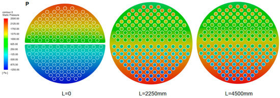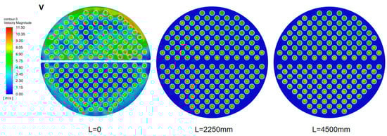 To investigate the interior of a fixed tube sheet heat exchanger, it is necessary to present the crucial parameters of the heat exchanger, particularly its cross-sectional and field distribution characteristics. Key parameters include the velocity field, temperature field, and pressure field within the heat exchanger. Figure 11, Figure 12 and Figure 13 show the velocity, temperature, and pressure states of different cross sections at the same time when they are stabilized after simulation: L = 0 mm, L = 2250 mm, and L = 4500 mm, respectively. In a steady state condition, Figure 11 illustrates the heat flow velocity variations at different locations within the heat exchanger. Initially, when L = 0 mm, the hot fluid enters the pipe at a relatively higher velocity. Upon entering the pipe, its velocity stabilizes, ultimately reaching a constant value of 9.94 m/s when L = 4500 mm. The flow of the hot fluid through the tube is unaffected by the velocity of the cold fluid circulating within the shell. Consequently, the hot fluid flow velocity remains uniform in both the upper and lower pipe segments for every cross-sectional location.