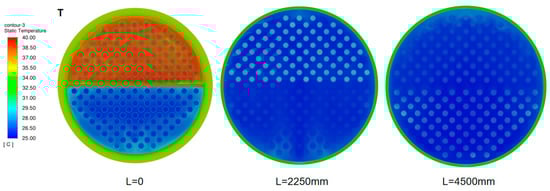 Figure 12 depicts the temperature distribution of the hot fluid at various locations within the heat exchanger in a steady state. When L = 0 mm, the hot fluid has just entered the upper part of the pipe and has not cooled, so the temperature is higher. When L = 2250 mm and L = 4500 mm, the cooling temperature of the cooling water in the shell gradually decreases. When the hot fluid is in the upper part of L = 4500 mm, it is first cooled, then flows to the lower part of L = 4500 mm, then back to L = 0 mm, and finally flows to the outlet. Therefore, at L = 0 mm, the temperature of the hot fluid attains its lowest point, ranging from 40 °C at the inlet to 27.54 °C at the outlet. This significant drop in temperature suggests that the heat exchanger’s heat exchange performance is well aligned with the desired target requirements.