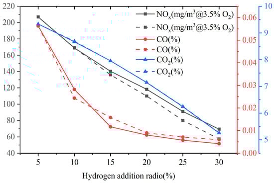 - Temperature and velocity fields are significantly affected due to the addition of hydrogen. The temperature in the combustion chamber shows a decreasing trend as the hydrogen addition ratios increase and the temperature peak moves towards the inlet direction. The reduction in combustion temperature reduces the emission of thermal NOx, resulting in a significant reduction in the overall NOx emission. In addition, hydrogen addition effectively reduces the emissions of pollutants CO and CO2.