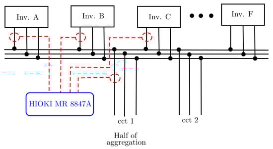The measurements were taken from a rooftop solar PV system that consists of six identical inverters each rated at 20 kW. Each inverter has been given an alphabetical identifier ranging from A through to F. The total power generated by all six inverters is fed to the utility network via two circuits. A Hioki MR8847A Memory HiCorder was used to record the individual inverter waveforms and aggregated currents of combined inverters. Hioki 9661 high-frequency current clamps were used to capture current waveforms. The data logger was configured to measure four current signals, i.e., the same phase of inverter A, B, and C, as well as half of the aggregation circuit. The measurement setup is illustrated in Figure 1.