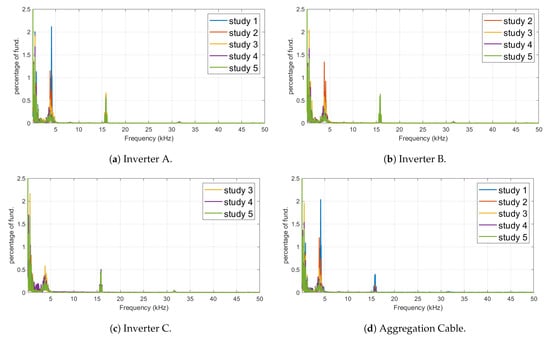 Time-domain current waveforms were measured at the locations shown in Figure 1 with an analysis interval of 200 ms and with a sampling rate of 100 kHz. This measurement arrangement allows the frequency spectrum up to 50 kHz to be obtained. The frequency spectrum, with a spectral component resolution of 5 Hz for each of the measured current waveforms for each study detailed in Table 1, is depicted in Figure 4.