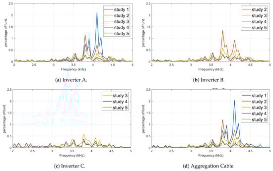 During study 1, since no other inverters are switched on, all of the harmonics generated by inverter A propagate to the supply grid. As expected, both inverter A and the aggregation cable have similar characteristics for single inverter operation, where the maximum individual harmonic component occurs at 4.1 kHz. However, when the second inverter is switched on, the maximum individual harmonic component occurs at 3.8 kHz, and emission magnitudes tend to decrease significantly. This phenomenon is identified as the resonance introduced by front-end filters, where increasing the number of inverters in operation affects the impedance characteristics seen by an individual inverter.