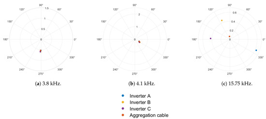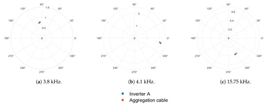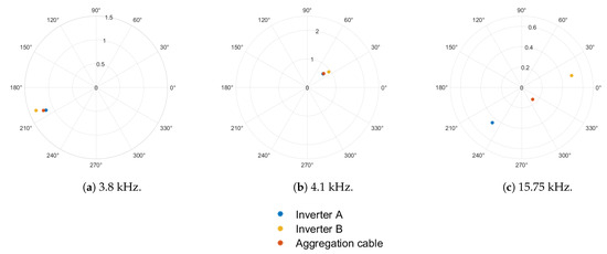 The percentage of fundamental current components at 3.8 kHz, 4.1 kHz, and 15.75 kHz are shown in Figure 7, Figure 8 and Figure 9 for 1-inverter, 2-inverter, and 3-inverter operation, respectively. For 1-inverter operation, all high-frequency harmonics seen at inverter 1 terminals are seen in the grid current. Individual harmonics in the two measurements are in phase, as depicted in Figure 7, irrespective of the frequency of interest. For multiple inverter operation, it is observed that harmonics at 3.8 kHz and 4.1 kHz are in phase, as depicted in Figure 8a,b and Figure 9a,b. However, harmonics at 15.75 kHz are dispersed in multiple quadrants of the phasor plane, as depicted in Figure 8c and Figure 9.