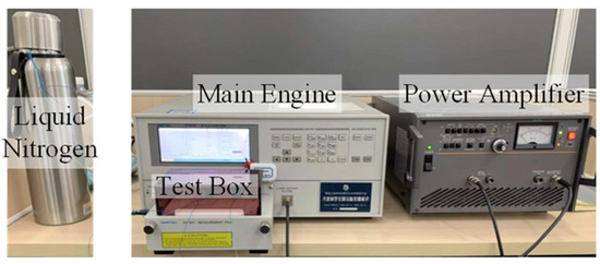 In order to explore the applicability of the stator materials of the cryogenic permanent magnet motor for the LNG pump, four kinds of silicon steel sheets were selected for ultra-low-temperature characteristic experiments. The experimental instrument was the SY-8258 hysteresis-loop measurement instrument. In order to compare the influence of ultra-low-temperature environments on the characteristics of silicon steel sheets, the four kinds of silicon steel sheets were tested at room temperature and ultra-low temperature. The room-temperature experiment was completed in a room-temperature environment of 20 °C and the ultra-low-temperature experiment was completed in a liquid nitrogen environment of −196 °C. The experimental equipment at room temperature and ultra-low temperature are shown in Figure 1 and Figure 2. Two copper wires were wound around the silicon steel sheet samples, which respectively served as the primary coil and the secondary coil. During the room-temperature experiment, the silicon steel sheet sample was placed in the test box and connected to the test box by copper wire. During the ultra-low-temperature experiment, the silicon steel sheet sample was completely immersed in liquid nitrogen for 1 h until it was stable and connected to the test box by the copper wire wound around the sample. During the test, the sample was placed in a liquid nitrogen container, which needed to be as closed as possible to prevent the rapid volatilization of the liquid nitrogen when in contact with air, which would have affected the test results [10].