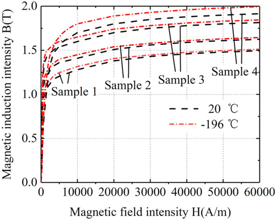 In this research, a cryogenic permanent magnet motor for an LNG pump was studied. The ambient temperature during motor operation was −161 °C (LNG) and the ambient temperature during motor shutdown was room temperature. The motor in this study was repeatedly at ultra-low temperature and room temperature. In order to explore whether the characteristics of the four silicon steel sheets were affected after being restored to room temperature from ultra-low temperature, the silicon steel sheets that had been stable at ultra-low temperature (liquid nitrogen −196 °C) were taken out and measured after standing at room temperature (20 °C) for 1 h. The magnetization curves (BH curves) of the four silicon steel sheets are shown in Figure 4.