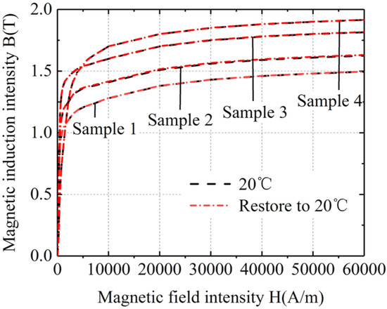 Figure 4 shows that the magnetization curves of the four silicon steel sheets after being restored to room temperature from ultra-low temperature basically coincided with the magnetization curves at initial room temperature, without any loss of magnetization characteristics. Therefore, these four kinds of silicon steel sheets can repeatedly work at ultra-low temperature and room temperature.