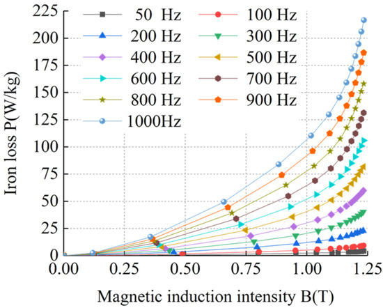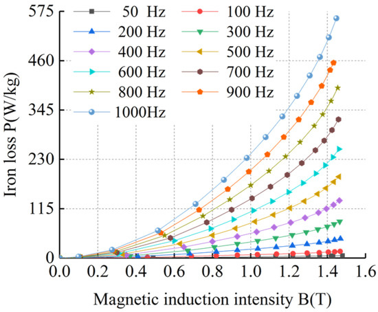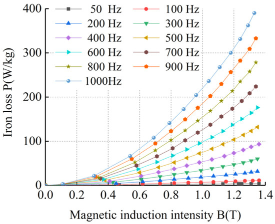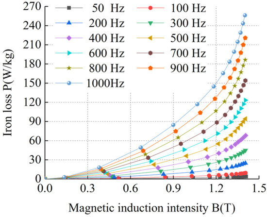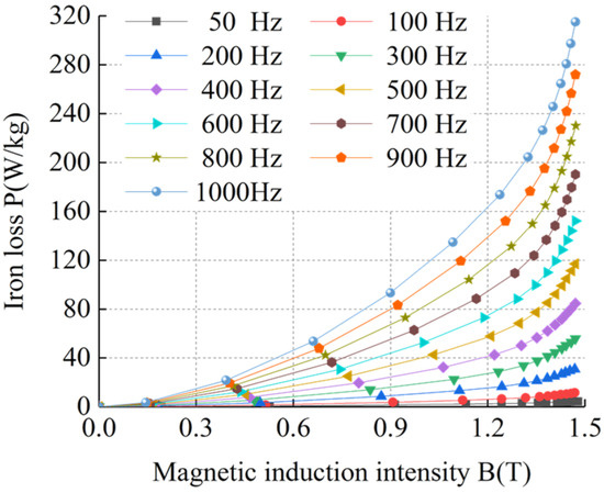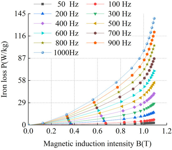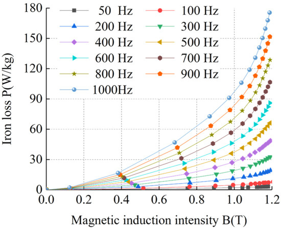 The basic iron loss of silicon steel sheets mainly consists of hysteresis loss and eddy current loss. In order to facilitate the numerical calculation of the basic iron loss of silicon steel sheets, an improved method of the basic iron loss calculation model of silicon steel sheets per unit weight was proposed. The improved calculation model for the basic iron loss of silicon steel sheets per unit weight is a function of frequency and magnetic induction intensity, which can reduce the numerical calculation steps of the basic iron loss of silicon steel sheets and increase the numerical calculation speed of motor stator iron loss [11,12,13]. The establishment of the improved iron loss model of silicon steel sheets is based on the following assumptions: the silicon steel sheet is uniformly laminated, the magnetic induction intensity is uniformly distributed in the silicon steel sheet, and the influence of the eddy current skin effect is ignored.