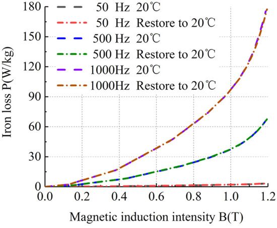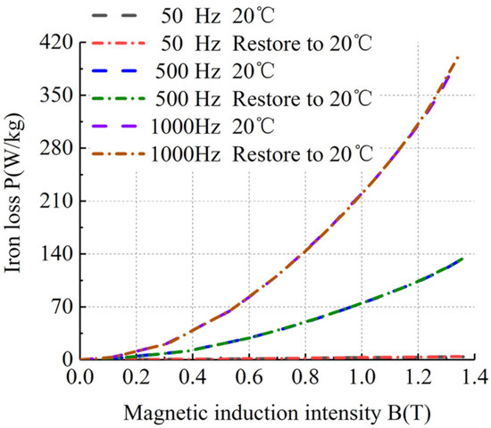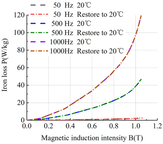Figure 13, Figure 14, Figure 15 and Figure 16 show that the loss curves at room temperature and ultra-low temperature recovery to room temperature basically coincided, without any loss characteristics missing. Therefore, these four kinds of silicon steel sheets can repeatedly work in ultra-low-temperature and room-temperature environments.