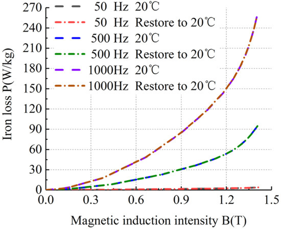 According to the comparison of loss curves of the silicon steel sheets, the loss of sample 1 was the lowest when the frequency and magnetic induction intensity were the same at room temperature and ultra-low temperature. Taking sample 1 as an example, based on the measured data of silicon steel sheet loss at room temperature and ultra-low temperature, the loss curve of silicon steel sheets was fitted by the least square method [14]. The hysteresis loss coefficient , eddy current loss coefficient , and material magnetic coefficient of sample 1 at different frequencies in room-temperature and ultra-low-temperature environments are shown in Table 1 and Table 2 [15].