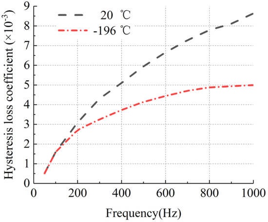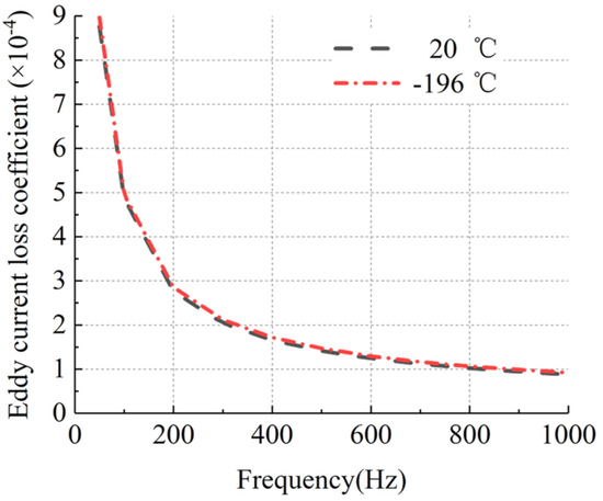 Figure 17 and Figure 18 show that the variation trends of hysteresis loss coefficient and eddy current loss coefficient were basically the same at room temperature and ultra-low temperature. The hysteresis loss coefficient and eddy current loss coefficient at ultra-low temperature were both higher than those at room temperature. The objective function Formula (4) was selected based on the curve of hysteresis loss coefficient and eddy current loss coefficient, and the curve was fitted by the least square method.