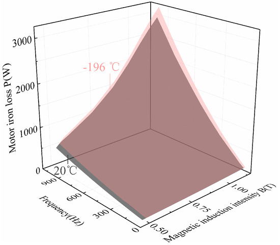 Figure 24 shows that under the same frequency and magnetic induction intensity, the iron loss of the motor stator at ultra-low temperature was always higher than that at room temperature, which is consistent with the change of the silicon steel sheet. It can be seen that the performance of the silicon steel sheet determined the change in motor iron loss, so the basic iron loss model of the motor could be studied based on the improved basic iron loss model of silicon steel sheets. The calculation formula of the basic iron loss for motors is shown in (10).