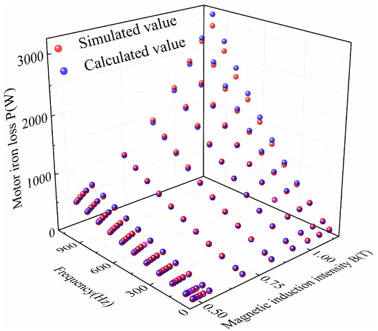 According to comparative analysis, the average fitting errors of the conversion coefficient fitting function at room temperature and ultra-low temperature were within 2%, meeting the actual engineering calculation requirements. The fitting function of the conversion coefficient was substituted into Formula (10) to obtain the iron loss of the motor stator. The calculated value of the motor stator iron loss was compared with the simulated value. The comparison results of the motor stator iron loss at room temperature and ultra-low temperature are shown in Figure 28 and Figure 29.