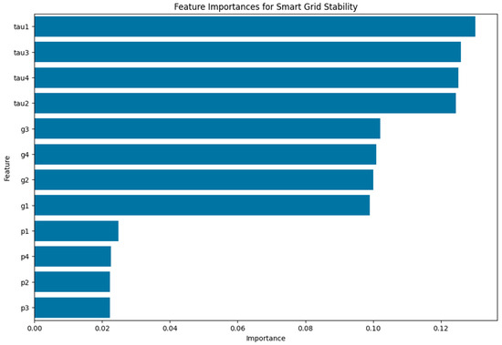 The decentral smart grid control system differential equation-based mathematical model was used to determine the input features [40]. To determine and validate the input variable, random forest was used to understand the importance of the features in predicting the stability of the smart grid [41]. After applying random forest to the 12 features obtained from the four-node star network, the importance of the features were determined and are shown in Figure 3. The importance of each feature is tabulated in Table 1. From the table, it is observed that “tau1” has the highest importance score of 0.130133, indicating it to have highest impact on smart grid stability prediction, followed by tau3, tau4, and tau2 which also have high importance scores. Features like p1, p2, p3, and p4 have lower importance scores, but still contribute to the model. None of the features can be disregarded as all 12 features collectively impact SG stability and contribute to the performance of the model.