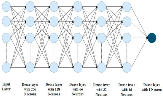 A multilayer DNN is also employed in this study to classify the stability of SGs. DNNs have the ability to learn complex patterns and representations from raw data. The multilayer structure of a DNN offers a powerful framework for smart grid stability prediction enabling accurate, scalable, and adaptive modelling of complex grid dynamics. The DNN architecture is fed with the extracted input parameters of an SG. Initially, 256 hidden neurons were introduced in the first layer (Figure 5). The second, third, fourth, and fifth hidden layer had 128, 64, 32, and 16 hidden neurons, respectively. The final layer consisted of 1 hidden neuron. A relu activation function was applied to the layers, except the final dense layer where we used a sigmoid activation. The learning rate of the model is 0.001 and it was trained for 20 epochs. In order to compute the epoch-wise error of the model, a sparse categorical cross-entropy loss was introduced along with an ADAM optimizer to reduce the error.