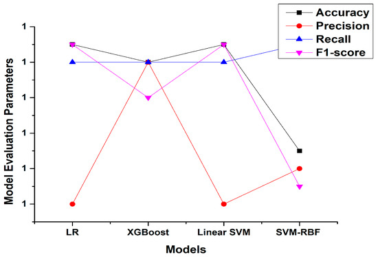 Table 3 shows that in the LR, Linear SVM, and SVM-RBF kernel models, accuracy was around 98.9%, while in the XGBoost model, it was slightly lower at 98.88%. The LR, linear SVM, and SVM-RBF kernel models had precision scores of 0.98, while XGBoost had a precision of 0.988. The recall scores of the LR, XGBoost and linear SVM were approximately 0.988, while SVM-RBF kernel model had a recall of 0.989. The LR, linear SVM, and SVM-RBF kernel models had F1 scores of approximately 0.989, while XGBoost had an F1 score of 0.986.
