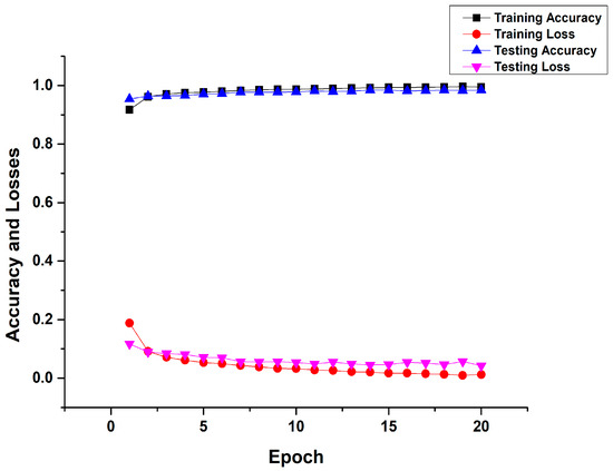 - The testing accuracy also showed improvement, starting from 95.38% in the first epoch and reaching 98.44% in the 20th epoch. This suggested that the model was generalizing well to unseen data and performing consistently on the testing dataset.