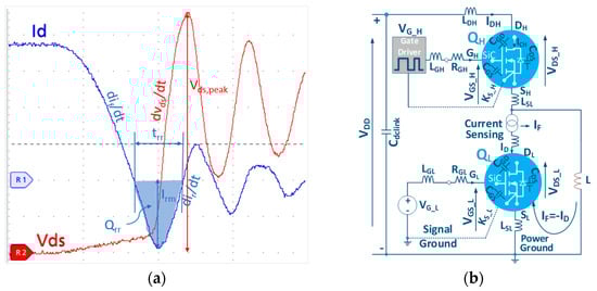 Reverse recovery occurs when the MOSFET body diode is switched off because of a positive voltage across device drain-source terminals (Vds). Before the switching-off, the charges in the drift region must be removed by a current that flows from the drain to the source, named the reverse recovery current [49]. Figure 1a shows an example of the body diode current and voltage during the switching-off and the quantities of interest that impact the reverse recovery analysis. The waveforms are obtained considering a classical half-bridge converter, as shown in Figure 1b.