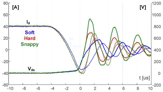 If S < 1, then the recovery is soft, else the recovery is hard, and when S is very high (S >> 1), the recovery is snappy (SR) [44]. Figure 2 reports the waveforms occurring in the three cases. The recovery is soft when the reverse current recovers to zero slowly and without oscillations impacting on the smooth rising of the drain-source voltage of the device working as a freewheeling diode. The recovery is hard when the current recovers to zero quickly, involving oscillations due to the resonant circuit formed by the stray circuit inductance and diode depletion layer capacitance. In this case, the diode reverse recovery can lead to serious voltage spikes. The recovery is snappy when these voltage spikes present an increment in the slope before reaching the peak. This increment is due to a faster charge removal. An experimental example of these three kinds of reverse recovery is reported in Figure 2.