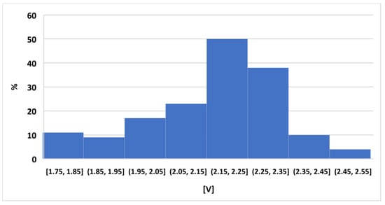 As reported in the electric scheme in Figure 2, the high-side device is used as a driver, and at its gate is applied a double pulse signal. The low side device is the DUT, and it is kept off by a negative voltage VG_L. Figure 4 shows the trends of double pulse test signals Vgs and Vds of the high-side MOSFET, the Vds of the low-side MOSFET and the load current. The front at which reverse recovery occurs is highlighted by the shaded orange area (t2). During the first pulse (t0–t1), the inductor L is charged. During the dead time between the two pulses (t1–t2), the inductor forces a current to flow through the body diode of the low-side MOSFET, and, in the rising edge of the second pulse (t2), a positive VDS_L is applied to the body diode, so its current decreases to zero and then flows in the opposite direction in order to carry out the charges stored in the drift region (reverse recovery current). The device used for this analysis is a Gen 3 750 V SiC MOSFET 11 mΩ. Three samples have been selected considering the distribution of static parameters among a sample of 200 devices. The devices under tests belong to three different values of threshold voltage, according to the statistical distribution reported in Figure 5. Considering that 50% of devices have Vth between 2.15 V and 2.25 V, this group has been considered to select the device (“Typ”) with typical Vth. The device (“Min”) with minimum Vth has been selected from the group 1.75 V–1.85 V, while the device (“Max”) with maximum Vth has been selected from the group 2.45 V–2.55 V. These three values of Vth have been chosen in order to investigate how parasitic turn-on (PTO) and snappy recovery (SR) are influenced by the threshold voltage of the device.