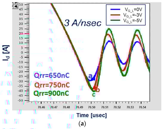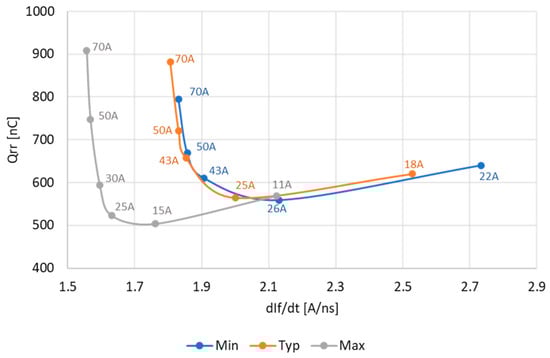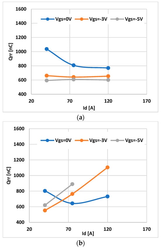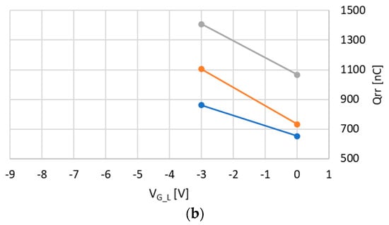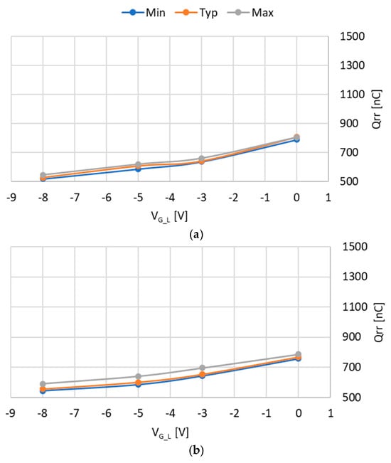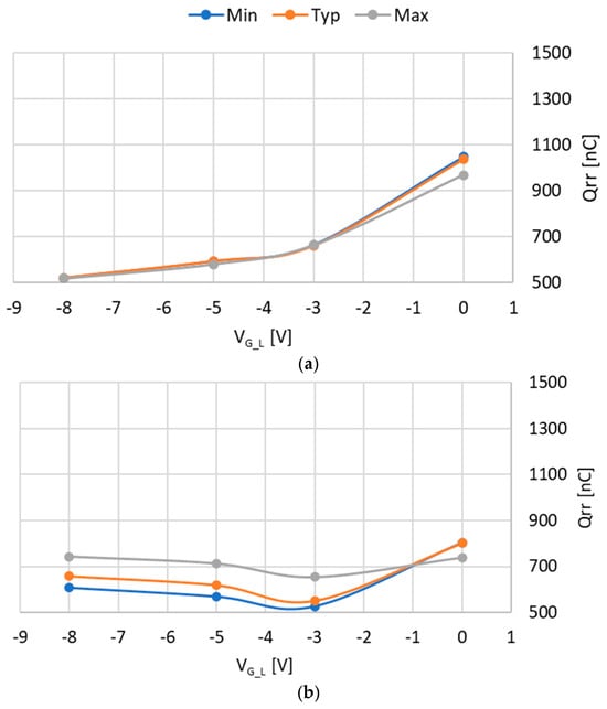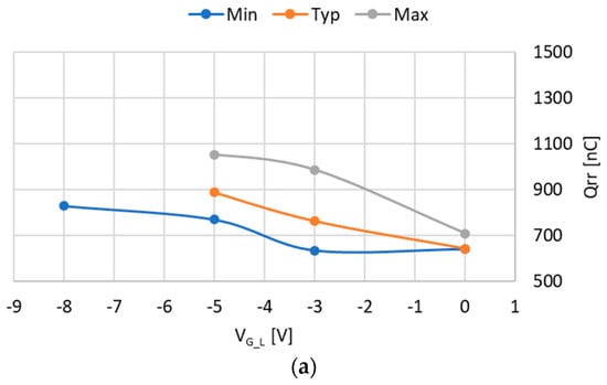 The reverse recovery response, inferred from the Qrr trendline at 25 °C, 40 A, in Figure 6a, is also confirmed at high currents, as verified by the results illustrated in Figure 9a,b, respectively, at 75 A and 120 A for the same devices under test: “Min”, “Typ” and “Max”. The Qrr in these two cases varies from 500 nC (VG_L = −8 V) to 800 nC (VG_L = 0 V) against the variation observed at 40 A, where it reaches a value of 1000 nC (VG_L = 0 V).