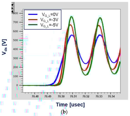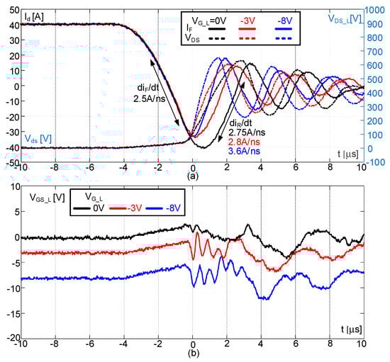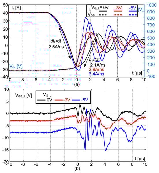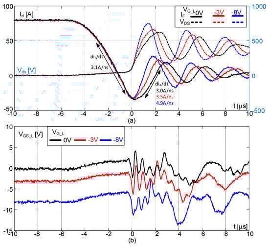 (a) Id, Vds and (b) VGS_L of device “Typ” at 75 A of forward current, 25 °C and different values of VG_L.