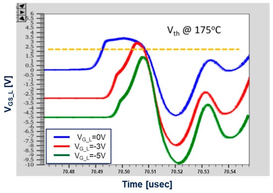 Comparing Figure 6a,b, the most significant result is related to Qrr values at VG_L = 0, where Qrr is higher at 25 °C than 175 °C, despite VGS_L overvoltages being higher at 175 °C than 25 °C. This means that at high temperature, Qrr trends cannot be justified only by PTO. The Qrr reduction at 175 °C and VG_L = 0 is reasonable, since Irm here is also lower than the case at 25 °C (−40 A at 25 °C and −25 A at 175 °C).
