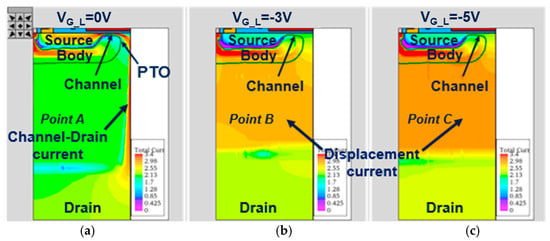 Figure 13a reports the magnification of the simulated body diode current (at 75 A) and Figure 13b reports the simulated Vds voltage for VG_L = 0 V, −3 V and −5 V at Tj = 175 °C. Figure 14 shows the gate-source voltage of the device operating as a freewheeling diode. The TCAD simulations confirm that Qrr decreases from 900 nC to 650 nC; hence, the higher the VG_L (shown in Figure 11), the lower Qrr. This happens despite the VG_L peak voltage, measured in correspondence with the maximum negative peak of the current Irm (points a, b and c in Figure 13a), overpassing the threshold voltage for a period sufficient to cause a PTO in the worst case (i.e., VG_L = 0 V). In addition, the color maps of the current density (Figure 15) (related to the maximum negative peak of Irm shown in Figure 13a) also confirm that there is a higher current density in the drift region when VG_L = −3 V and VG_L = −5 V than when VG_L = 0 V. This counterintuitive behavior of the current density in Figure 15b,c is due to a displacement current, which flows in the drift region due to the variation of the parasitic output capacitance voltage during the commutation of the high-side device. This current causes an increment of charges in the drift region and, consequently, a higher Qrr with respect to the case at VG_L = 0 V. It is also worth noting that the device with a higher threshold voltage (Max) presents the highest Qrr, as evident from Figure 11.