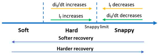 It is desirable to have fast recovery, and this can be achieved with a high current and voltage slope. However, in this case, the reverse recovery will belong to the “hard” type, as indicated in the JEDEC standard [15]. Unlike soft recovery, where voltage and current profiles do not present significant overvoltage and/or overcurrent, in this case, oscillatory behavior during the recovery is expected. The hard recovery can become snappy for specific values of forward current, slope, temperature or VG_L. Hence, it is useful to change these operating conditions to identify when this phenomenon is triggered. A representation of this occurrence has been illustrated in Figure 16.